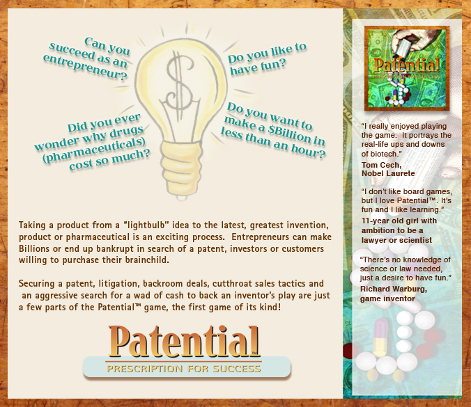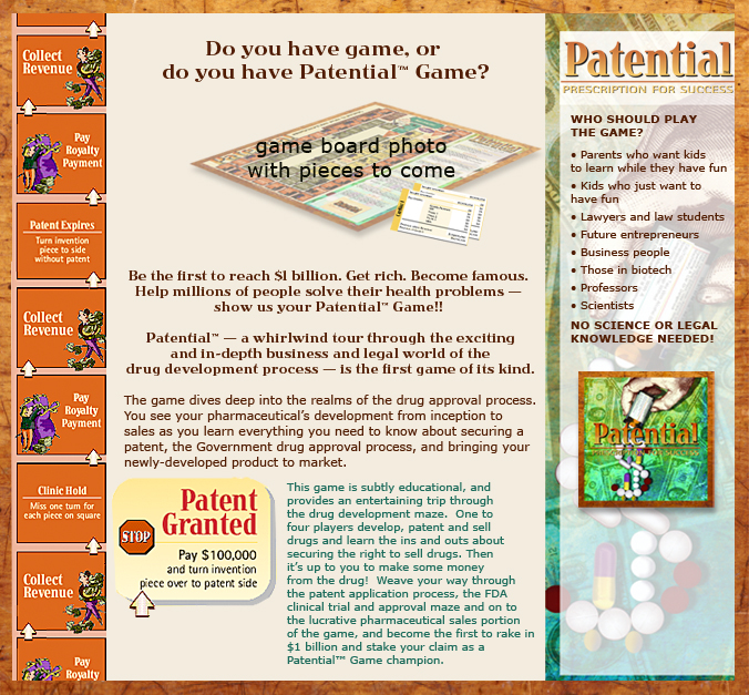 What if learning pharmaceutical development could be as engaging as playing Monopoly? That’s the idea behind PATENTIALā„¢, a strategy board game that takes players through the complete journey of bringing a drug from laboratory to marketplace.